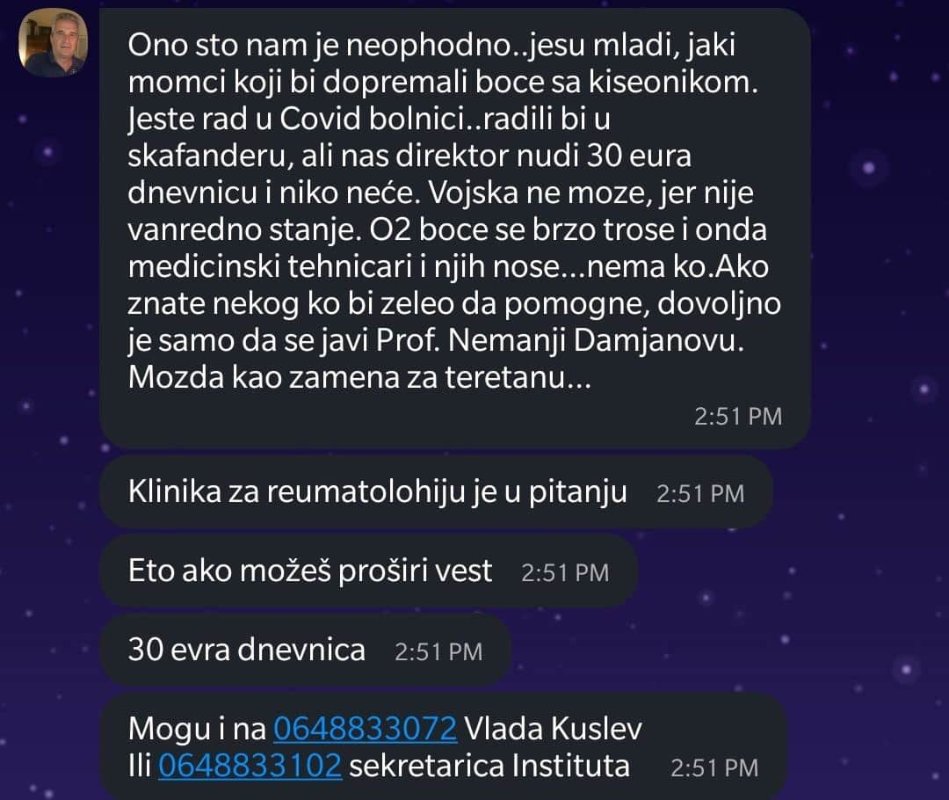 Ono sa zahtevom za pomoć pri hendlovanju boca je vrlo realno. Bolnica je na 6 spratova, puna liftova i stepenica, ne postoji mogućnost da sada neko provlači instalacije kao u Areni.