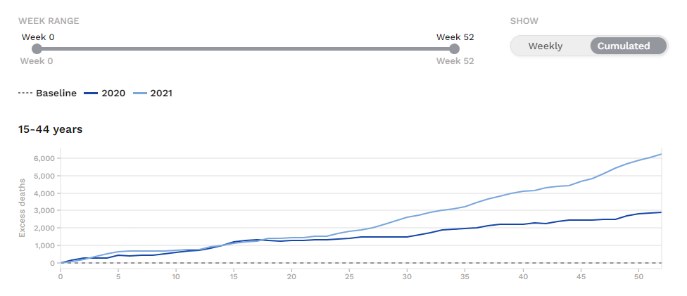 Možeš li da odeš na EuroMOMO, pogledaš za kojih 29 zemalja se prati ukupna smrtnost i onda da odeš na, recimo, OWID i pogledaš za te iste zemlje smrtne slučajeve od korone počev od sredine juna? Tokom juna, jula, avgusta, septembra i oktobra 2021. godine, kad su jedva i ljudi na samrti umirali od korone u tim zemljama, mi govorimo o značajnom porastu smrtnosti 15-44 populacije. Mhmmm dobra fora.