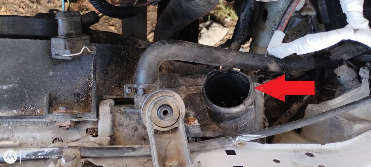 Prvo kupi original crevo za taj auto, nemoj ovako krpljeno da stavljaš. Kad kupiš original, njegov oblik će ti reći gde i kako ga montiraš. Obično na gornji priključak hladnjaka ide crevo koje vodi tečnost iz motora.