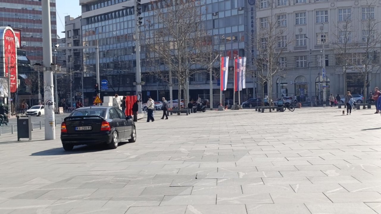 Čovek se nešto malo zbunio ili je prosto mislio "preko Trga" kao prečicom, negde od ćoška Narodnog muzeja u smeru Terazija ? Ali su ga stubići sprečili da sa Trga opet normalno sidje na ulicu ... Pa je morao da se vraća.