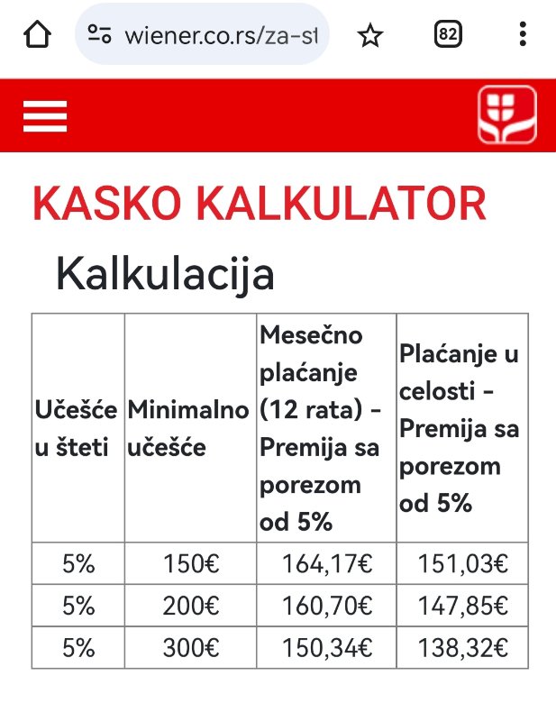Tražio sam objašnjenje danas i dobio odgovor da mi je poslata ponuda za klasično kasko osiguranje, a ne mini kasko. Tražio sam ponudu za mini kasko. Tražio je dodatno da li želim da osiguram stakla, što sam potvrdio, na iznos od 20.000, računam da je to negde realna cena zamene. Očekujem sutra ponudu za mini kasko.