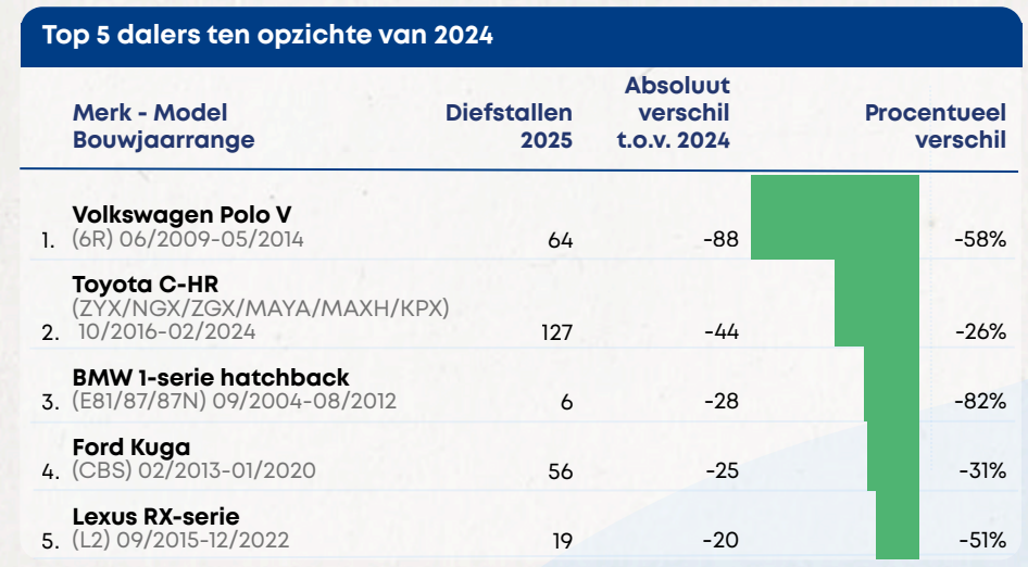 De top 5 gestolen auto’s ziet er als volgt uit: