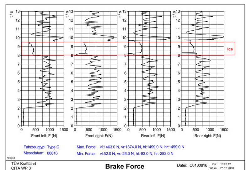 Evo kako se kreće brzina točkova pri forsiranom kočenju ABSom i na drugom dijagramu sila kočenja na točkovima, na probnom stolu. Par sekvenci po sekundi, a očgledno je da pad brzine točka mobiliše kočionu silu.