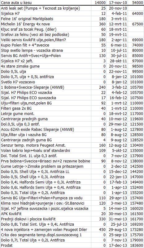 Ja sam prestao da pisem od kada sam zavrsio sa taxijem, 2007. tada mi je bilo bitno. Sada zadrzavam auta kratko, ako imam ulaganja u tom periodu pamtim, pri prodaji svedem racunicu (formiram cenu)da sam min na 0 tj da me osim goriva auto nije nista kostao. Ako pretekne dobro, ako ne opet dobro.