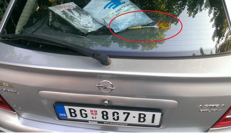 Takav urbanisticki haos je tesko naci u okolini. Primer privatnog vozila saobrajca, koji je ostavio i svoju "ispravu" u vozilu.