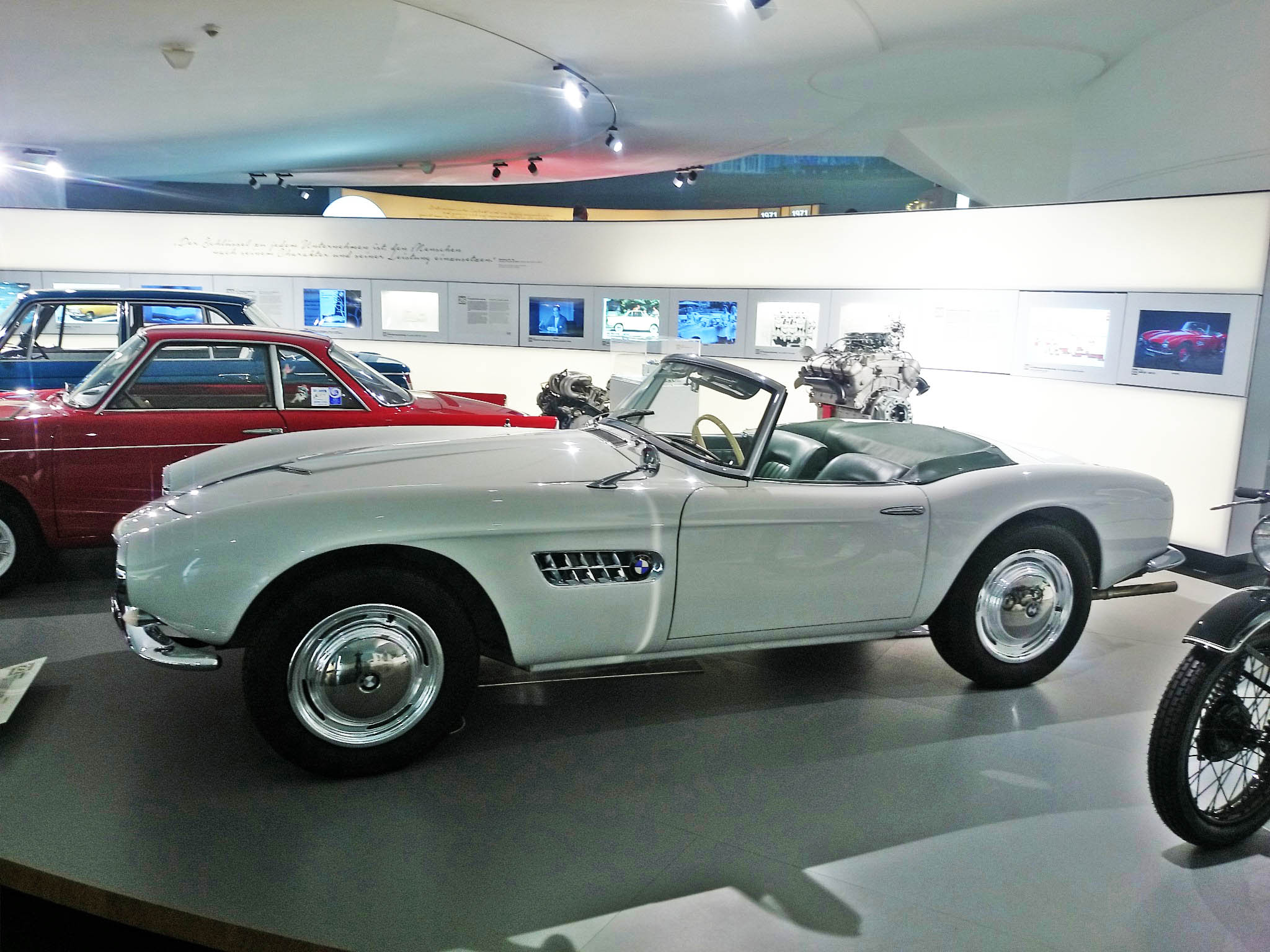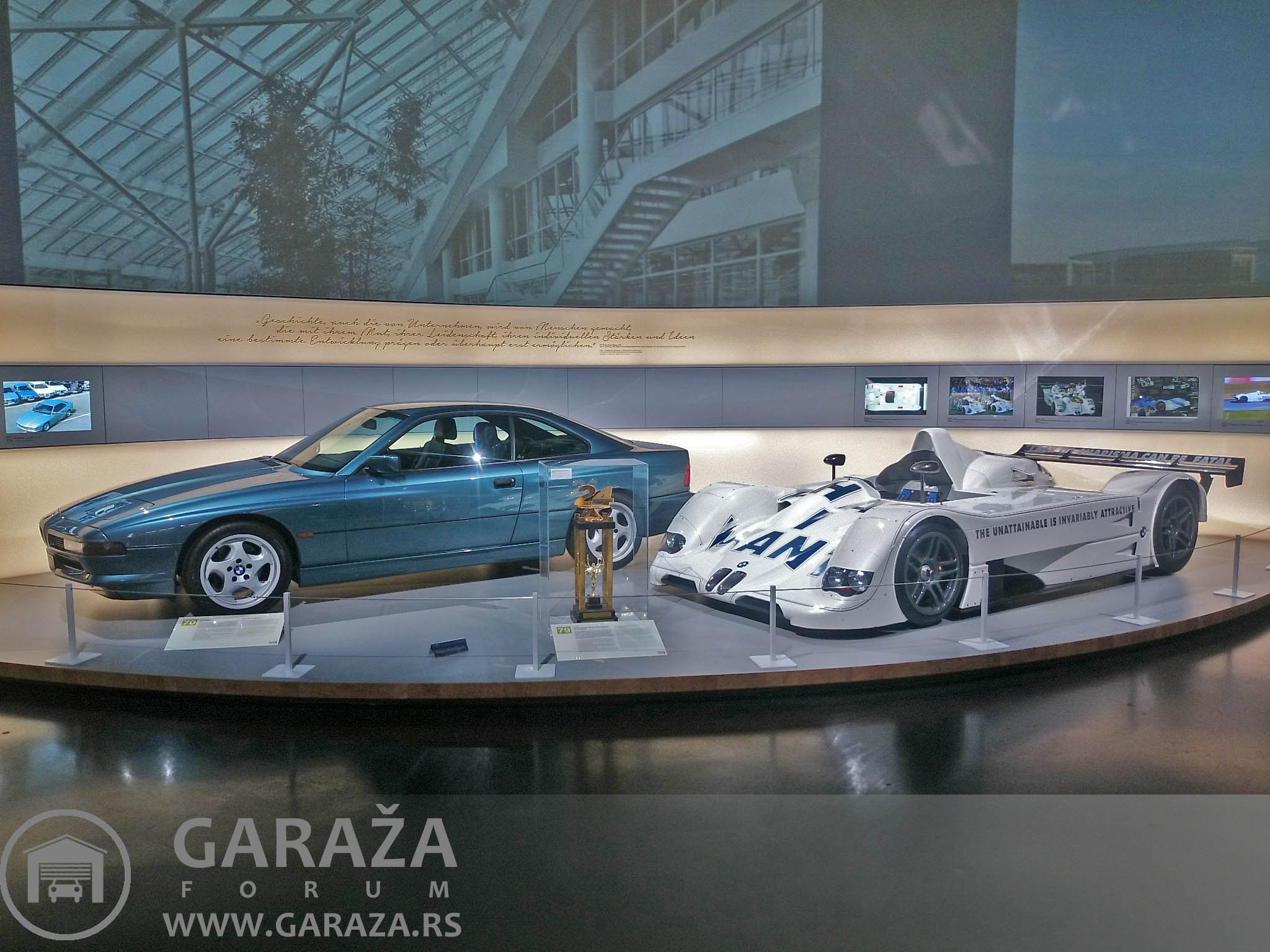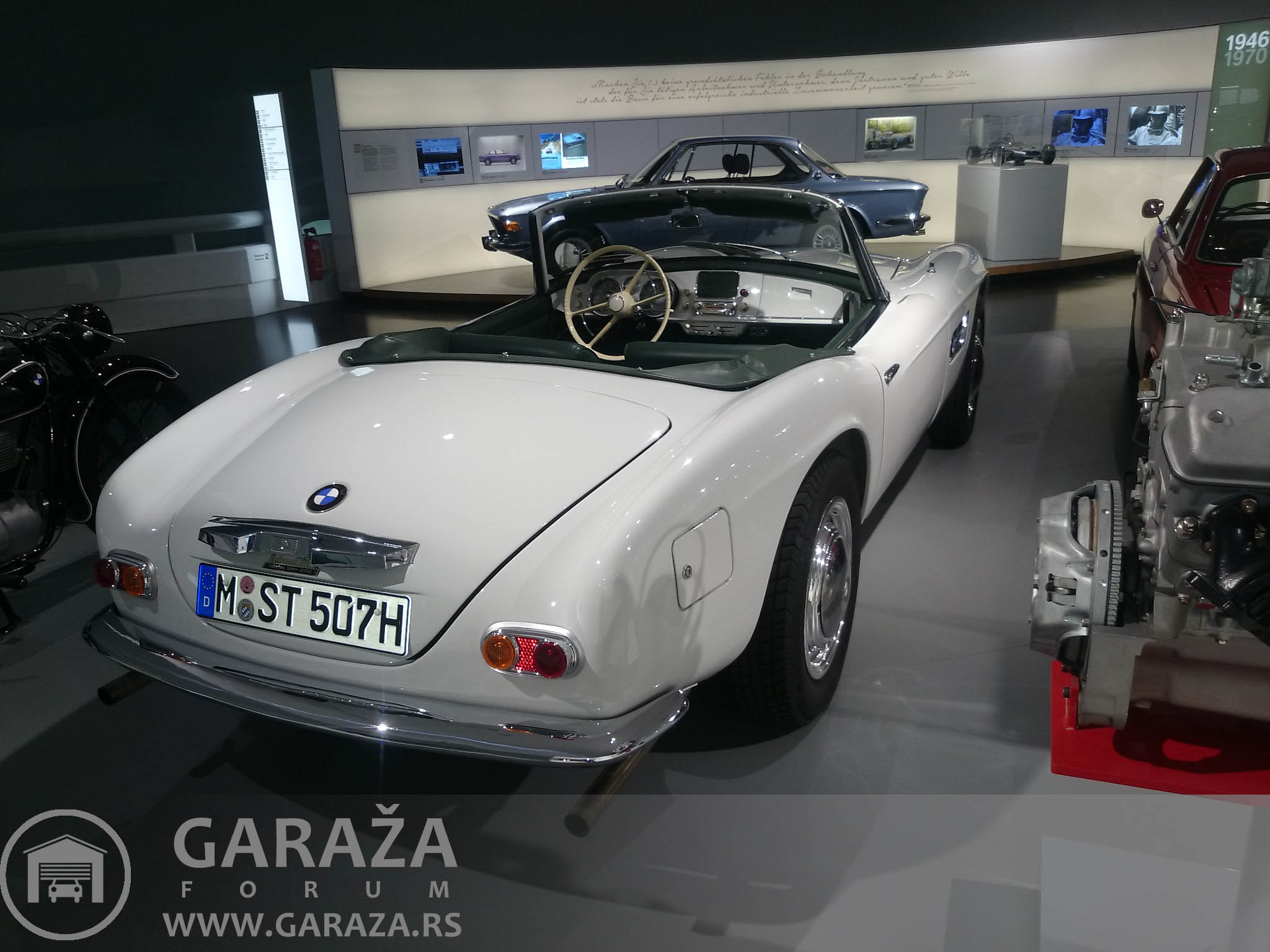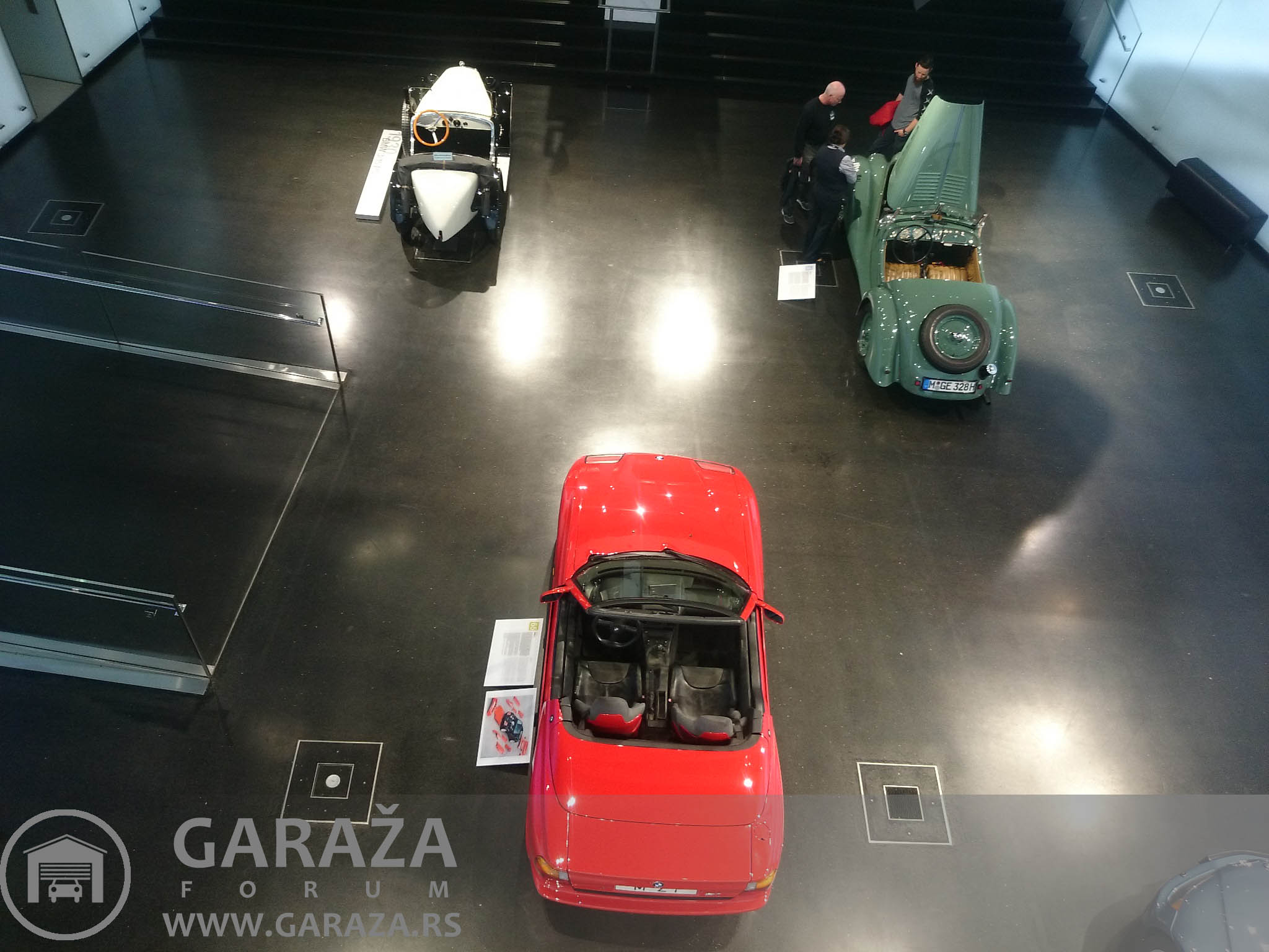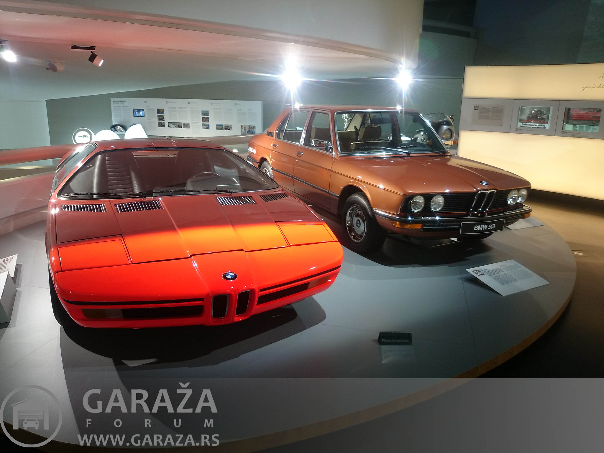 Nakon posete smo obisli i muzej BMW-a. Pojedinacna ulaznica je 10 eura. Muzej je organizovan po nivoima, okuplja vozila, kako automobile, tako i motocikle. Nabrojacu samo neke od eksponata, BMW 507, koji je napravljen u svega 200-njak komada i koji je umalo doveo fabriku do ivice bankrota. Kuriozitet je da izlozeni model ima gume proizvedene, pogodicete-u Srbiji. Zatim koncept M1, koji ima vrlo interesantnu boju, za koju bi se lako moglo reci da je produkt presijavanja zbog ugla reflektora, a u stvari je boja na karoseriji potpuno razlicita nijansa crvene, svetlija i tamnija. Izlozen je i koncept Gina koji ima panele karoserije od materijala nalik platnu. Izlozen je i RR Phantom 102EX hibrid, kao i pobednicki bolid sa Le Mansa 1999. Od bolida F1 su izlozeni Brabham sa BMW turbo motorom iz 80-ih, i BMW Sauber bolid koji je okacen na zid. Jedna soba je posvecena samo seriji 3, gde su izlozeni svi dosadasnji modeli do prosle generacije, zatim postoji soba sa M modelima, posebne sobe sa agregatima, kako vozilskim, tako i avionskim, klipnim i mlaznim. To bi bilo ukratko, slike govore mnogo vise od reci, i jos jednom topla preporuka za posetu, zaista vredi svakog ulozenog eura.