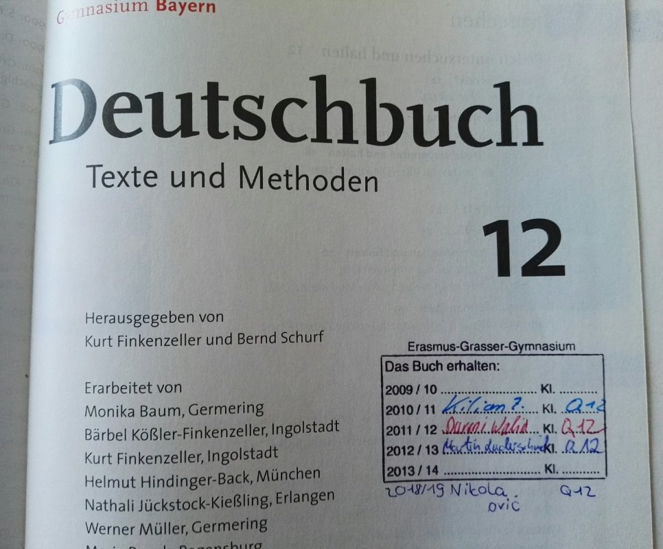 Verovatno postoje i roditelji koji kupe set knjiga, ali onoliko koliko sam ja čuo od svojih klinaca otprilike 90-95% učenika koristi mogućnost "iznajmljivanja" knjiga od škole. Krajem školske godine se knjige vraćaju. Tim koji je zadužen za logistiku povratka knjiga i istovremenog izdavanja knjiga za sledeći razred je obično sastavljen od jednog profesora i nekoliko učenika 12og razreda. Ne vraćaju svi odjednom nego se odredi dan posebno za svaki razred. Kada se knjige vrate proverava se da li ima oštećenja. Ukoliko postoji oštećenje ono se upisuje na stranici na kojoj je ovaj pečat kao na slici i upiše se datum. Onaj ko je dobio novu knjigu i nju oštetio plaća veći deo cene, ako je knjiga već dve, tri godine u opticaju srazmerno manje. Ako je knjiga stara 5 godina zadnje oštećenje se plaća 2-3€. Knjigu koji na kraju godine plati učenik može ako hoće da ponese kući. Nama se do sada desilo samo jedanput da je sin oštetio knjigu (valjda pre 3-4 godine, zaboravio sam) i platili smo 12€. Inače, za sve ove godine ni centa za knjige. Onda se učenik koji je dobio knjige upiše u listu na ovom pečatu tako da se zna kod koga su knjige bile u tekućoj godini i koliko su "turnusa" okrenule, pošto se desi da se neka knjiga neke godine i ne izda, jer je svakako više knjiga nego djaka u razredu.
