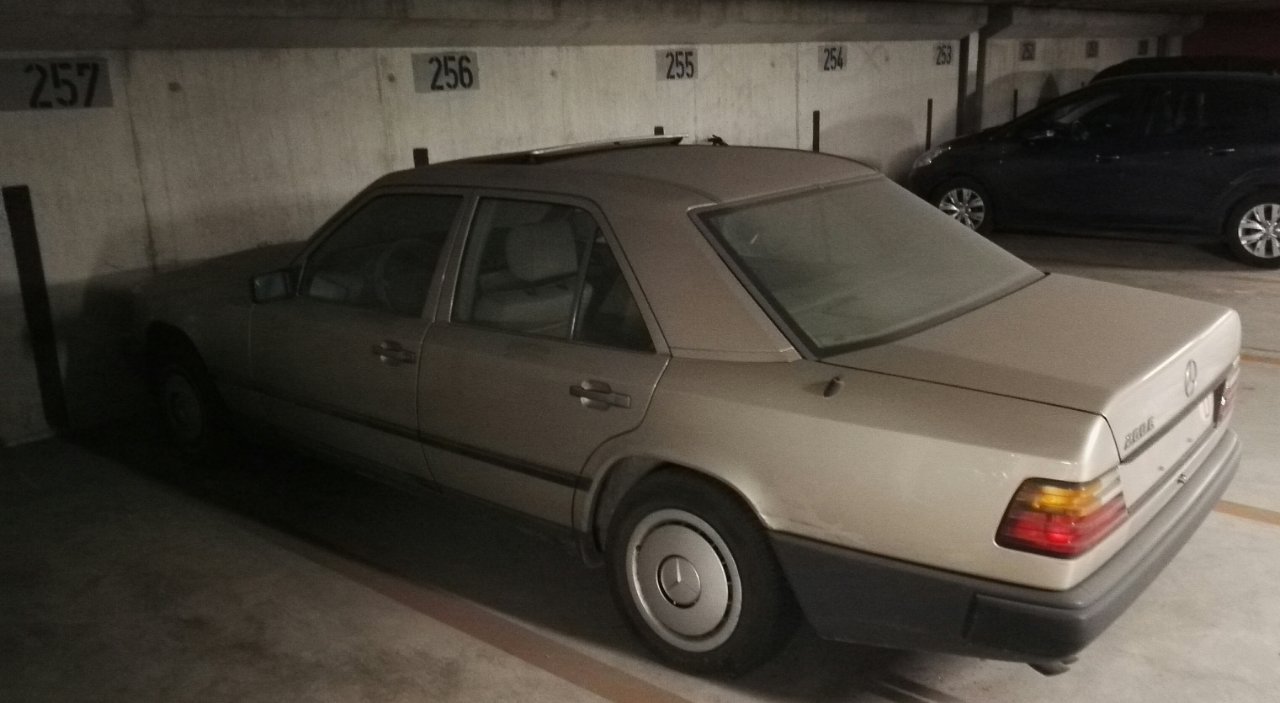 MB260E, parkiran preko puta našeg auta, stoji ovde najmanje 19 godina (toliko dugo stanujemo mi u zgradi, auto sigurno stoji duže). Gume su od 1988, profil kao nov, na satu 138.000km. Nemam pojma čiji je, a ovi što održavaju zgradu ne smeju da kažu ko je vlasnik parking mesta. Da je iznajmljivao parking mesto za ovih 20ak godina bi uzeo oko 10K€ (40€ mesečno).