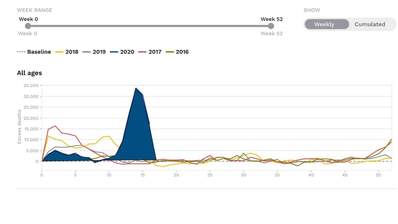 Evo Vam opticka iluzija, koliko je ljudi umrlo, izvor euromomo koji ima "zive podatke" a ne projekcije. Iako izgleda da je znacajno vise u 2020 to nije tako.