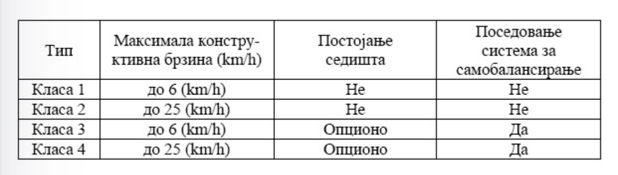 Autori u svom radu navode i nacrt standarda koji ova vozila grupiše u četiri klase po ključnim elementima, kao što je prikazano u narednoj tabeli.
