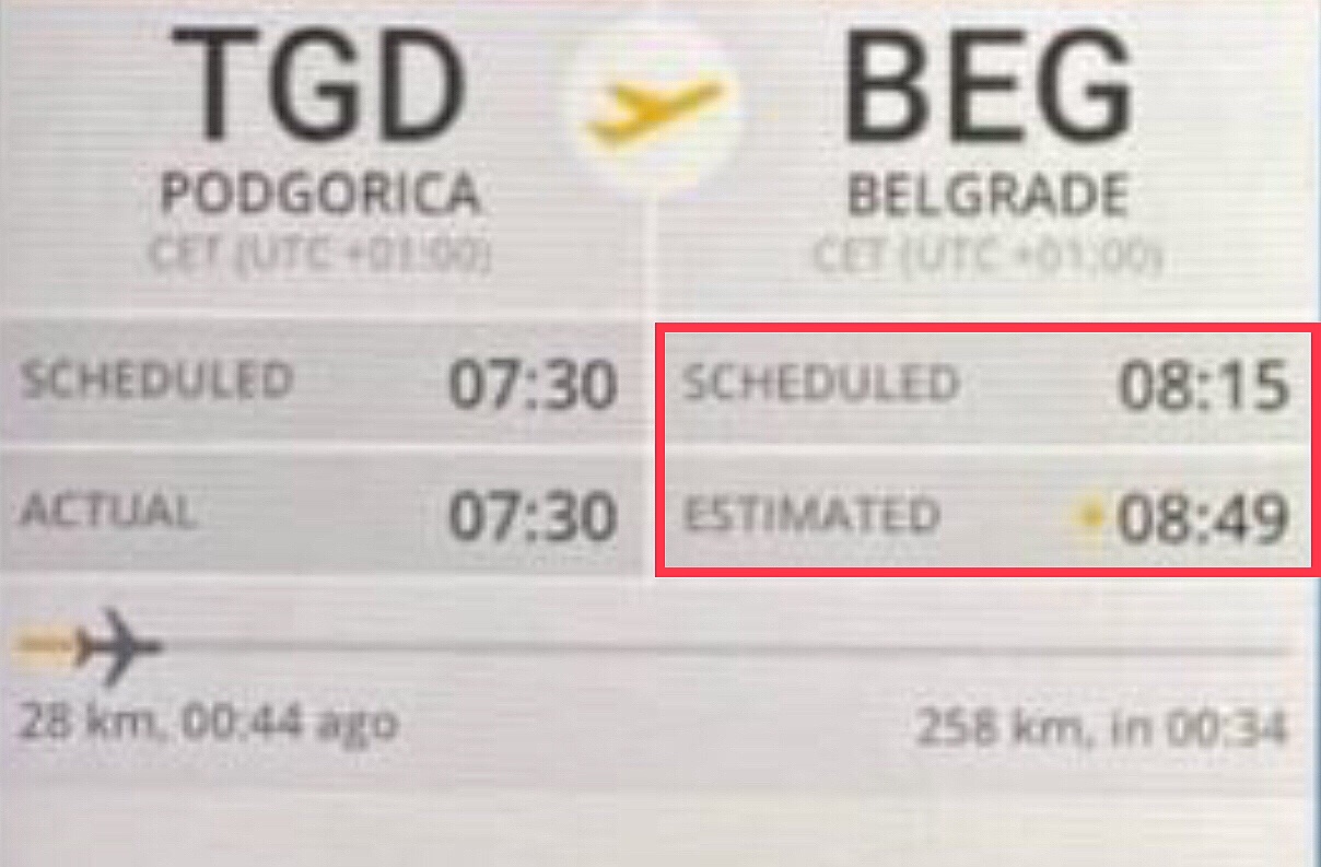 Po planu leta, avion je trebao sleteti u Beograd u 08:15, a produzio je let 34 minuta i sleteo u 08:49. Sta da mu je umro putnik u 08:35? “Gde ste do sada?” - “Crtao sam srce iznad MN, znate ovo je emotivan dan za sve nas....”