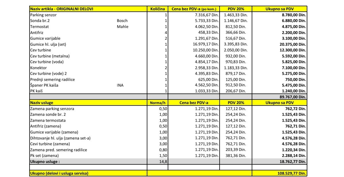 Auto ide, izbacivao je par puta neku gresku, i znao sam da ce nesto trebati da se radi, ali par stavki mi je sumnjivo skupo.. Pocevsi od parking senzoraDay Walker napisao: 18 Mar 2021, 14:59 Ovde je bila havarija neka?