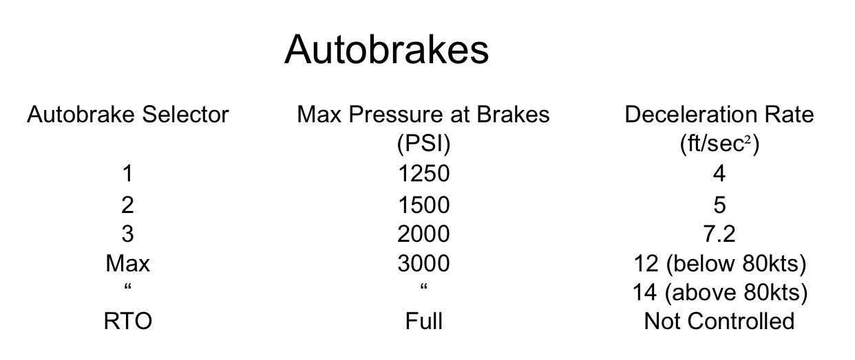 Selektor za kocenje se pred poletanje postavlja na RTO (rejected take off), a pre sletanje zavisno od tezine, duzine piste, i nekih drugih parametara na 1,2,3, max.