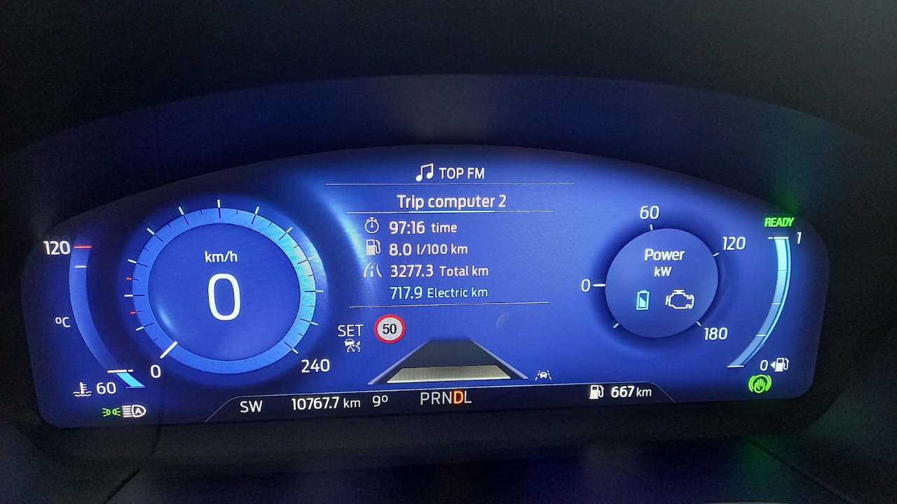 A evo je ispod i jedna slika borda hibridne Kuge, kada sam u nju seo, prosek potrošnje je bio 8,0 uz prosek brzine od oko 33 km/h na prethodnih 3.277 km ( od čega 717 km u EV modu, što znači da je EV mod bio oko 22% ukupne distance, dok je meni EV mod bio blizu 26% ). Prosto, prosečna potrošnja i kod hibrida zavisi od „milion faktora“.
