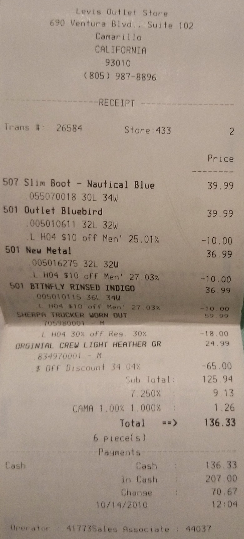 Nasao neki stari racun iz USA, 4 farmerke, jedna postavljena jakna i jedan duks, za $136. Outlet. Pre skoro 5 godina.