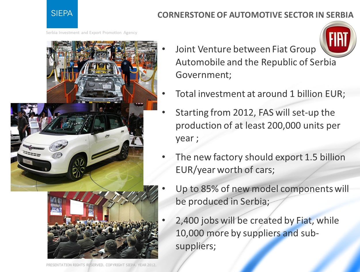 Ovaj model i nije predvidjen da bude jeftin i za siroke mase, vec nesto kao 500, ima za te pare boljih automobila sto se tice odnosa cena/kvalitet, pa opet ide prodaja, slicno i Mini, pretpostavljam i A1, dakle mi smo ovde sklapaci (manje bitno) i dobavljaci delova (mnogo bitnije), sto znaci da ce nesto vise para ostati kod nas a ne samo plate i porezi (moguce da FIAT to neko vreme ne placa, potpuno je verovatno). Ono sto se radilo sa Puntom je vise bilo ispumpavanje para iz drzave (dok su delovi stizali od spolja narocito), jer je FIAT ostavljao ovde plate, a novac za sirovine i ostalo se odlivao napolje. Uglavnom mi nismo ovde primarno trziste za ono sto proizvodimo, slicno kao i kod Kineza. Slazem se da ako ovo krene moze postati veliki zamajac za celokupnu privredu, s tim da nama treba minimum nekoliko ovakvih investicija (naravno da rade punom parom) da bi se nekako povratili na nivo od pre 2008. iz realnih osnova, ne prodajama preduzeca i kreditima. Drzim palceve da ovo uspe.