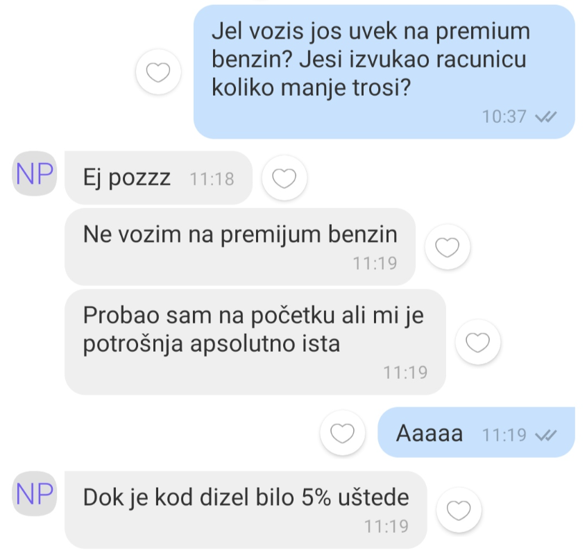 A koje je vaše mišljenje, vredi li kupovati "premijum" gorivo u odnosu na "obično"? Tipa, benzin G drive (oko 185 dinara) i običan benzin (170 i koji dinar)? U smislu para.