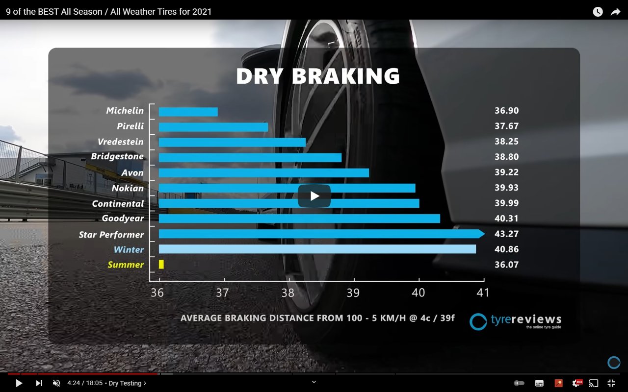 Рачуна се да све гуме за сва годишња боље коче него најбоља зимска на сувом ал опет не довољно добро као летња. Дакле, те гуме су компромис.