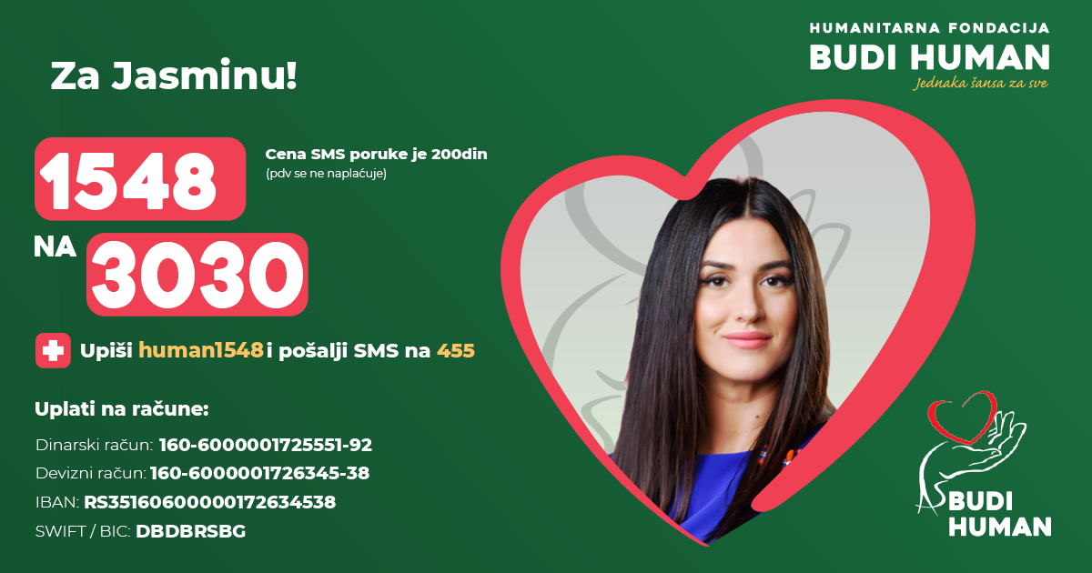 Danas sam saznao da moja draga koleginica Jasmina Krušedolac prolazi kroz užasno težak period već 10 meseci. Nažalost, dve teške operacije nisu dale rezultata i da bi ponovo stala na noge i oporavila se potrebne su dve operacije u inostranstvu. Putem ovog sajta pikupljaju se donacije. Pomozimo Jasmini da vrati osmeh i ponovo živi život kakav zaslužuje.
