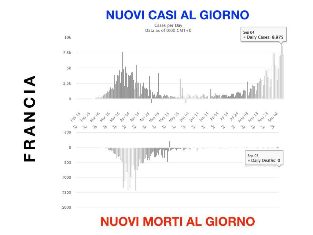 Vreme bas brzo ide, evo danas je 08.sept, hajde da vidimo za nedelju dana, kad jos 7x 6-10000 ljudi u Fra bude registrovano sta ce se desiti. Isto i za Italiju. Italija ima 1500-2000 dnevno i nula ili nekoliko umrlih, videcemo sta ce i kod njih biti za 5-15-30 dana.