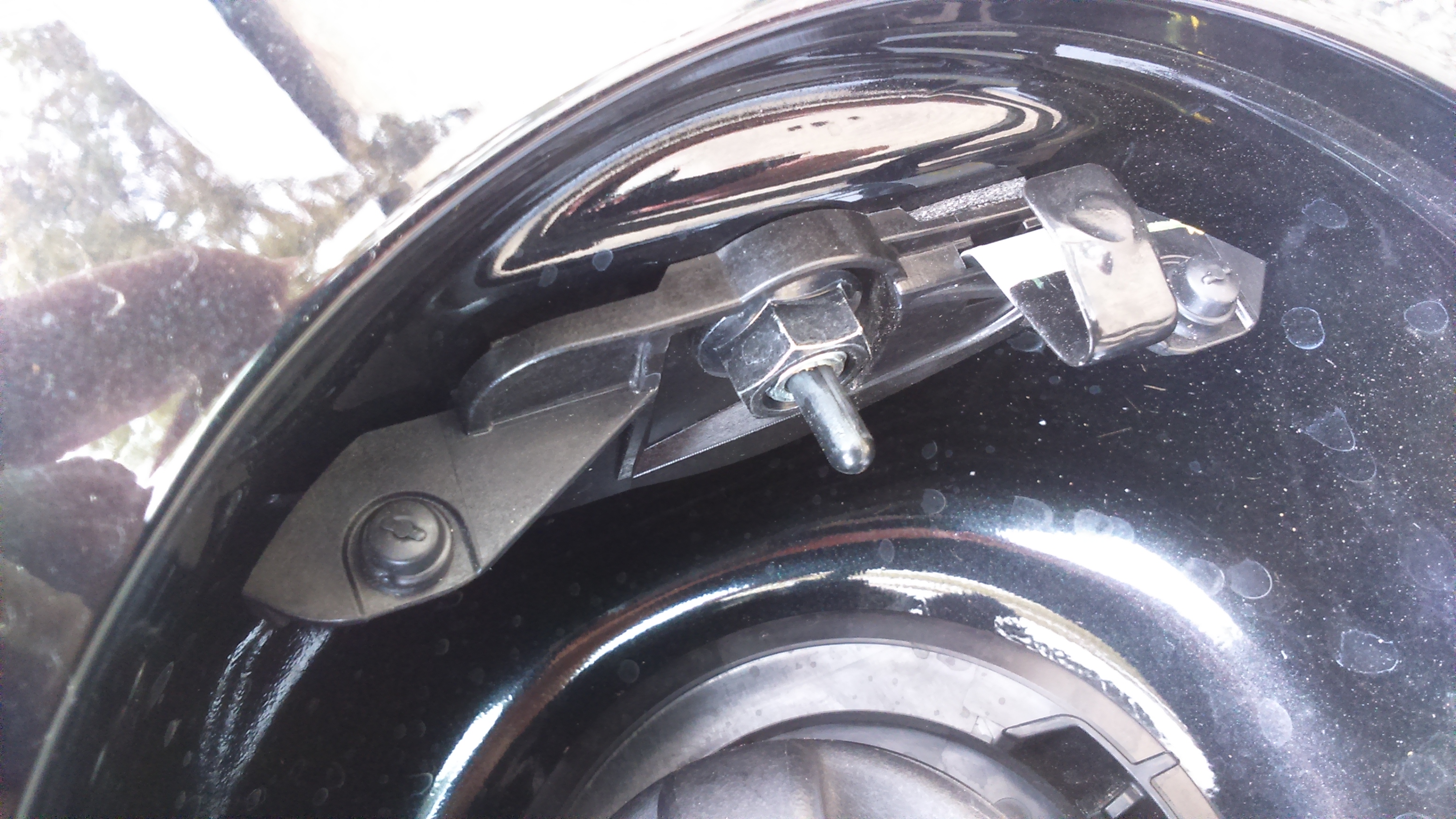 Evo, gledam otvor za sipanje goriva i pitam se kako i kojom silom je pumpadzija uspeo da iskrivi poklopac. Deo na karoseriji ima gumene odbojnike do kojih vrata mogu ici. Celicni "U" lim ima ulogu opruge kako bi nakon povlacenja rucice u kabini vratanca iskocila.