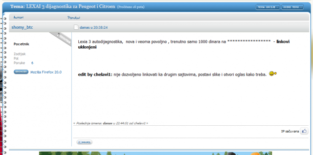 Pozdrav, gledam za drugara da kupi neku autodijagnostiku za Citroen i video sam veoma povoljno LEXIA autodijagnostiku na Limundu. Moze da se koristi i za Peugeot. Pretpostavljam da je kineska al trenutna cena je vrlo mala evo pogledajte ovde. Na drugim sajtovima se krece oko 15.000dinara. E sad, dal ima neko iskustva sa ovim uredjajem, dal je pouzdan, znam da nije kao original koji je preskup, hvala.