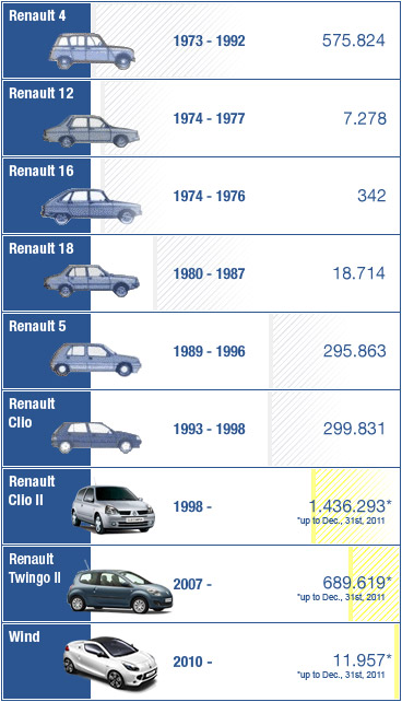 The Revoz plant dates back to the mid 50s when a company called Agroservis started to carry out maintenance of agricultural machinery. Under the name of Moto Montaža, the company began to assemble light commercial vehicles and DKW vehicles on the basis of cooperation with Autounion, a German company. In 1959 it was renamed IMV (Industrija motornih vozil – Industry of Motor Vehicles) and is started to produce caravans as well. From 1967 to 1972, the company cooperated with the British Motor Company (assembly of Austins). At the beginning of 1973, a cooperation agreement was signed with Renault and the production of the Renault 4 was started. During this period, a limited number of Renault 12, Renault 16 and Renault 18s were assembled as well. In June 1988, a joint venture between Renault and IMV resulted in the foundation of Revoz, in compliance with the regulations of that time. At the end of 1989 Revoz started to assemble the Renault 5, alongside the Renault 4, popularly called "katrca“, the last unit of which was assembled in Revoz in December 1992. It was also in Revoz that the last Renault 5 came off the assembly line in July 1996, after having been on the car market for nearly 25 years. In April 1993, the Renault Clio began rolling off the Revoz production line, followed by the second generation Clio in the spring of 1998, and by the Clio II in 2001. In 2002, Revoz changed its organisation: commercial activity was taken over by a commercial subsidiary called Renault Slovenia (actually: Renault Nissan Slovenia), while Revoz maintained its range of industrial activity. Renault became a 100% owner of Revoz in 2004, a year later the project of exclusive manufacturing of the new Twingo in Revoz was confirmed. Serial manufacturing of the new Twingo started in spring 2006 for the whole European market and the project has been supported by the Republic of Slovenia as well.