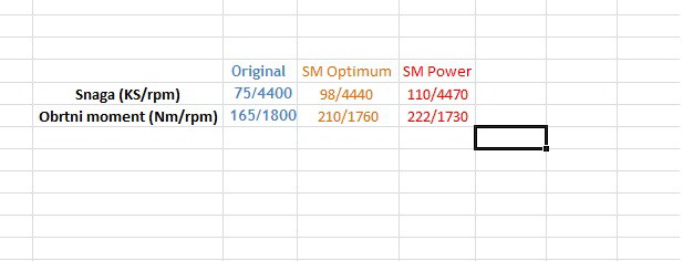 Pa to da, SM-ova Optimum mapa je kao standardna u RS-u, s tim što SM ima tu Power mapu koja pojačava još više. I što u SM-u chipuju sve i dizele i benzinjare, dok u RS-u piše šta može, šta ne. Npr. gledam cene meni za Mitsubishija u RS-u samo ponuđeni DI-D, a ovi imaju sve, ali npr. chip za običan 1.3 benz je 400/500e, a diže za 8/12KS. Mislim da precenjuju sebe. :mrgreen: