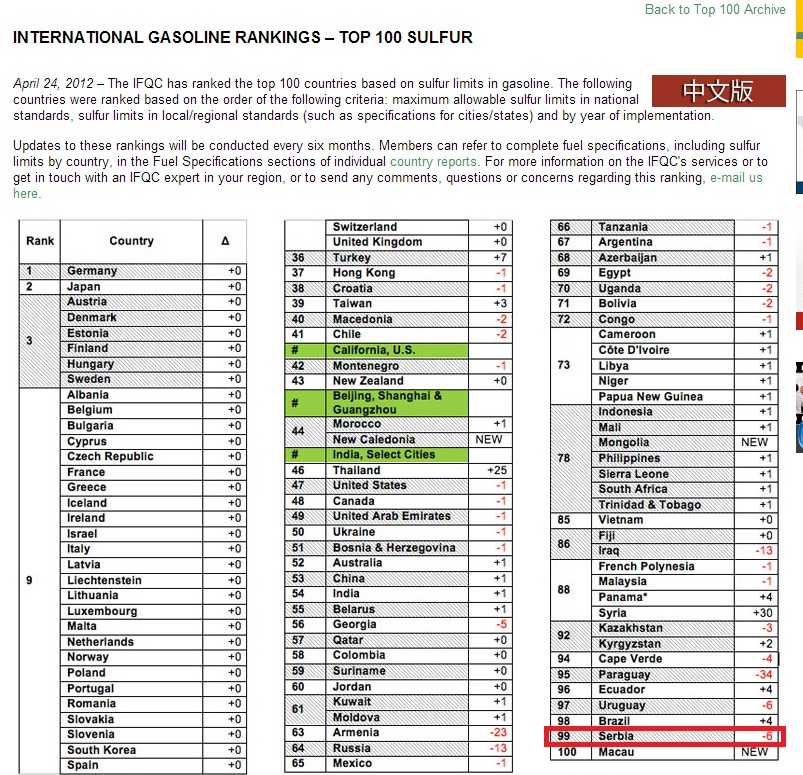 Pre 2 godine, a pogle Albanija gde je bila pre 2 godine. Doduse i parametri su malo nedoreceni, ali rezultat verovatno nije bez veze ovakav. Da ne pricamo da je medju poslednjima ukinut benzin sa olovom, itd. Jel bilo skoro neko nezavisno istrazivanje kvaliteta goriva u Srbiji?