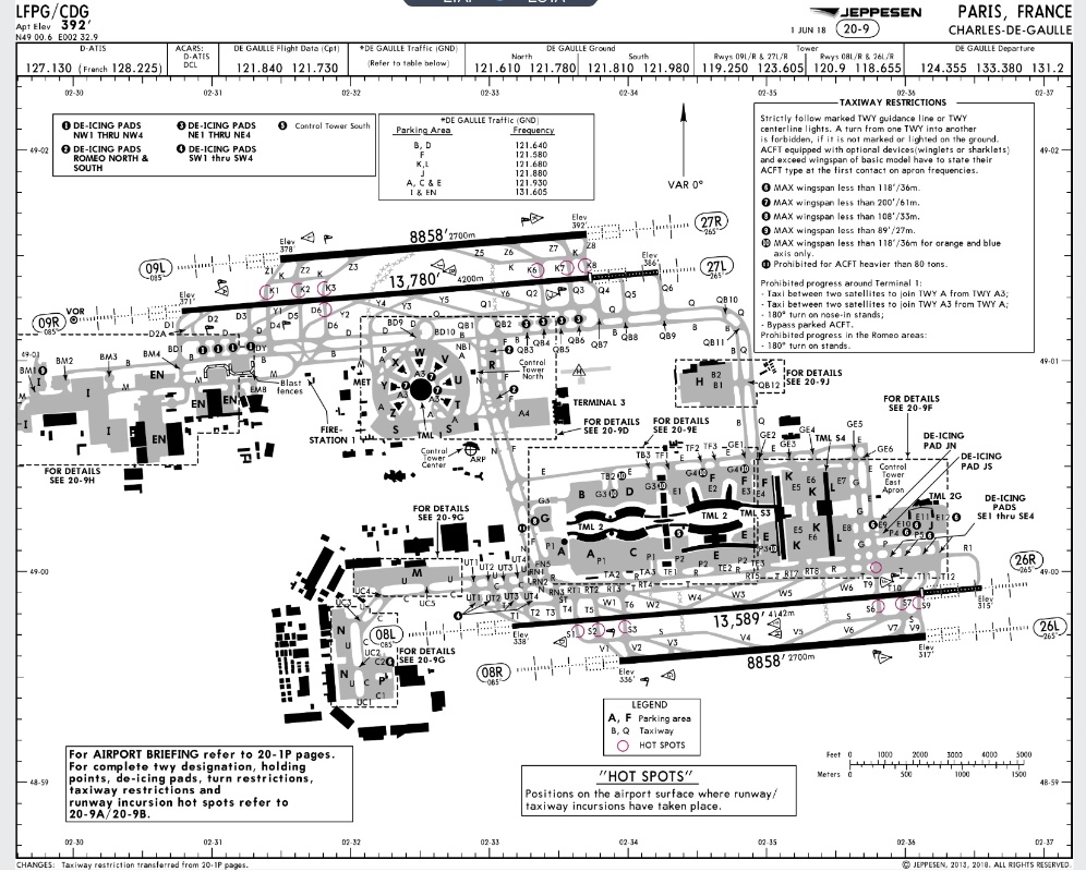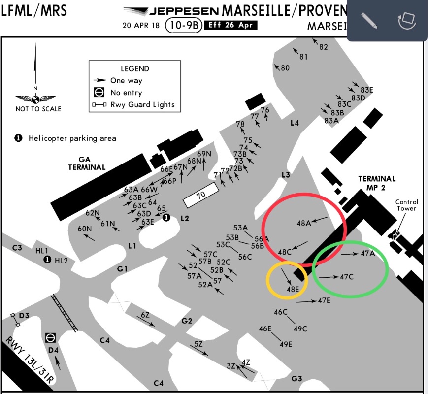 Karta je usmerena ka Severu. Za pozicije 48 A i C, ulazi se izmedju zgrada u nekom kursu 020 i onda avion okrece za nekih 190 stepeni, da bi mu nos gledao na Jug - Jugozapad.