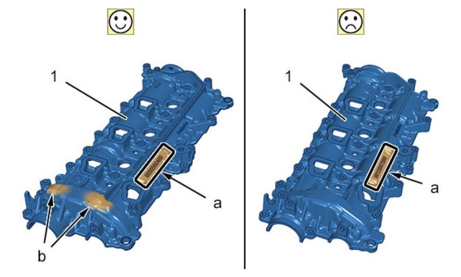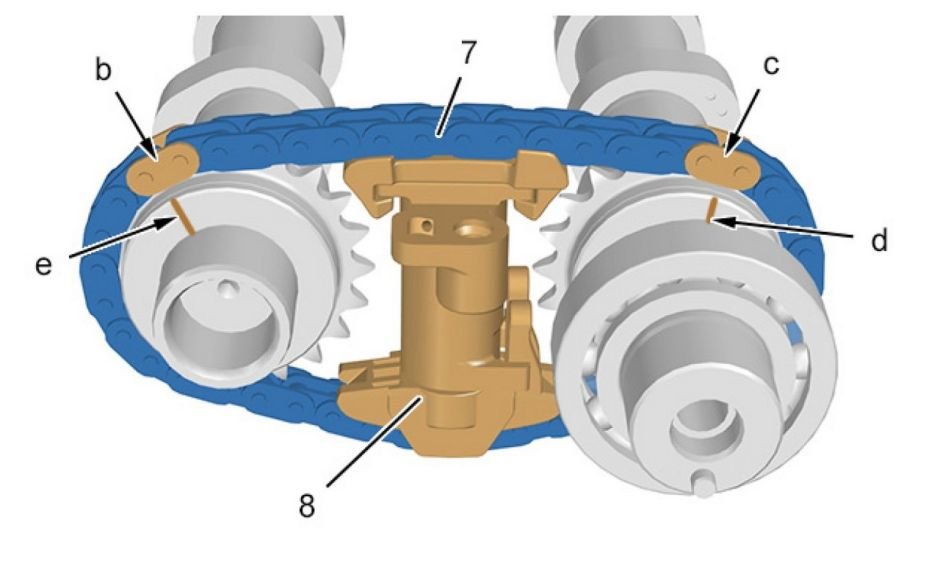 Ne možeš staviti samo širi lanac. Drugačiji su i španer, a i poklopac glave ( stari poklopac na mestu "a" nosi oznaku 98 126 472 80. a novi 98 305 804 80 ). Ovaj noviji poklopac ima "izbočine" na mestima koja su sa "b" označena na slici ispod.