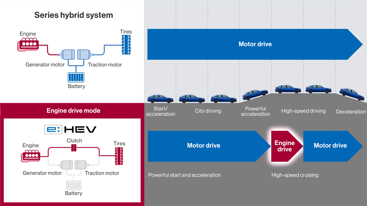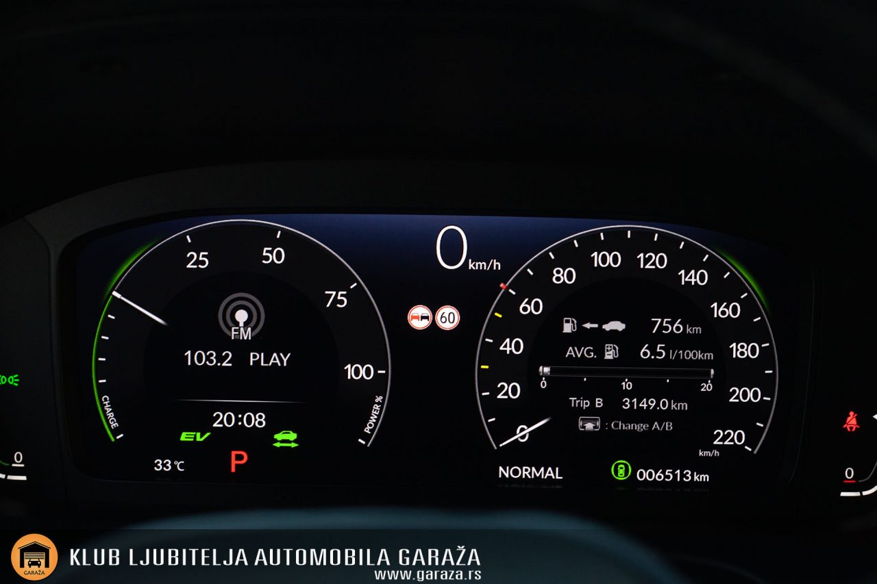 Njegov hibridni sklop još je jedna zanimljivost i velika prednost u odnosu na veliki broj konkurenata. Honda ga je nazvala i-MMD, što je skraćenica za Inteligent Multi Mode Drive. Ispod poklopca motora smešten je 2.0-litarski četvorocilindarski benzinac, sa 4 ventila po cilindru. pogonjen lancem, koji proizvodi 143 KS pri 6.000 o/min. Međutim, ovaj motor samo po potrebi pogoni prednje točkove, dok veći deo svog radnog veka pokreće samo generator struje. Glavni pogon je elektromotor koji je snažniji i smešten je u kućište menjača (e-CVT – samo jedan stepen prenosa). Ima 184 KS i 315 Nm maksimalnog obrtnog momenta, a napaja se iz relativno male baterije od 1.05 kWh, ali koja se stalno dopunjava. Da rezimiramo, pogonska snaga dolazi od elektromotora, a ne od motora sa unutrašnjim sagorevanjem. Pri maksimalnom opterećenju će se i on priključiti, ali u praksi to radi vrlo retko.