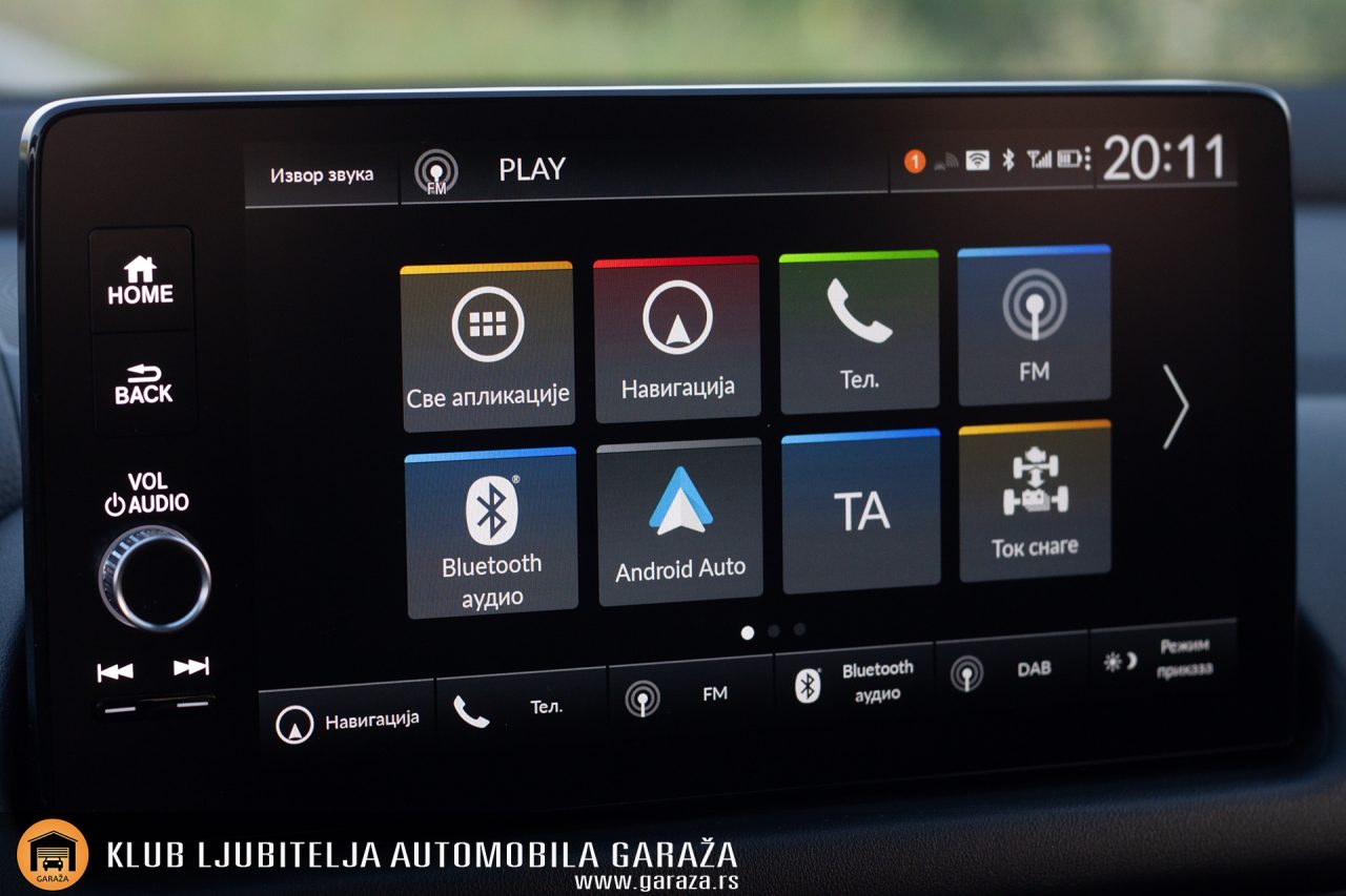 Honda CONNECT NAVI naziv je multimedijalnog sistema kojim se upravlja putem ekrana izdvojenog na sredini centralne konzole. Ekran je veličine 9″ što možda deluje malo za današnje pojmove, ali zanimljivo je da nalazimo i nekoliko fizičkih tastera i prečica, kako bi se lakše upravljalo. Korišćenje multimedijalnog sistema je zaista lako, može se odabrati i srpski jezik, a sam sistem je veoma brzog odziva. Opcija Android Auto je omogućena bežično i to radi bez greške. Naravno, omogućen je i CarPlay.