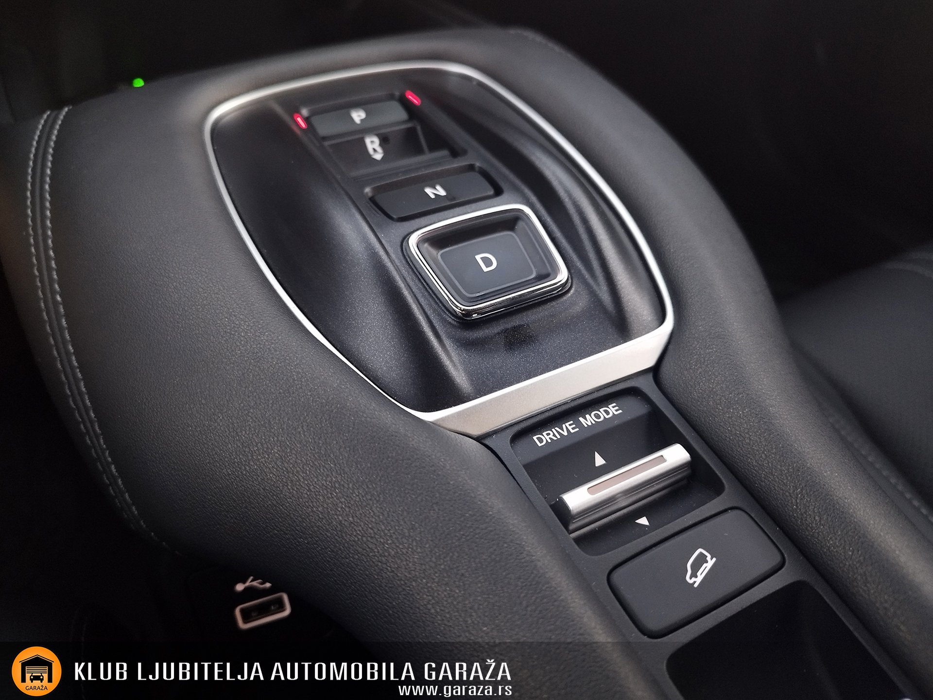 Mesto gde svakako nismo navikli na tastere je pozicija na kojoj se inače nalazi ručica menjača. Obzirom da je u pitanju hibridni pogon, u kombinciji sa e-CVT menjačem, izostaje potreba za ručicom manuelnog menjača. Honda se, poput nekih drugih proizvođača, odlučila da se i funkcijma automatskog menjača, upravlja tasterima. Na prvi pogled možda deluje zbunujuće, ali svako ko je vozio automatik poznaje značenje oznaka D, N, R i P. Dok je za sve ostale funkcije dovoljno pritisnuti odgovarajući taster, ovde je za R(everse), odnosno vožnju unazad, potrebno je povući taster ka sebi. Što i ima neke logike, zar ne.