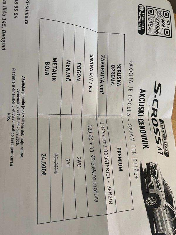 Pozdrav kolega. Ja sam pazario S Cross-a 2023., automatik, 1.4 MHEV, AllGrip, niža srednja oprema (rikverc kamera, parking senzori napred i pozadi, grejanje sedišta, 7” centralni ekran, adaptivni tempomat, alu felne, kožni volan itd.).